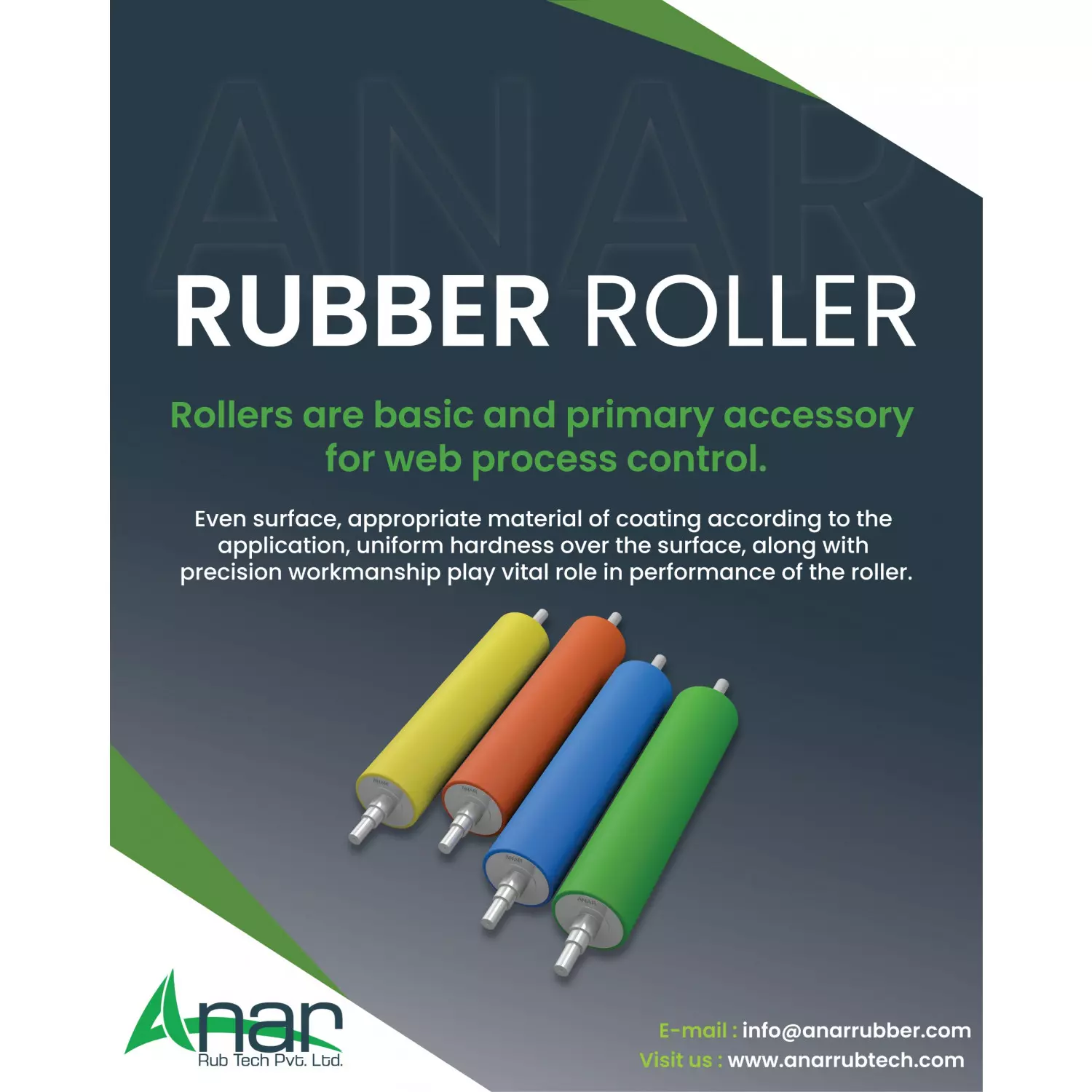 Our rubber rollers are specially designed to meet the finest requirements of applications in paper, textiles, plastic, and many other industries. It has proven its reliability time and time again in demanding environments. Rubber rolls manufactured at Anar Rub Tech Pvt. Ltd. provide a wide range of advantages, such as wear resistance, antistatic property, chemical resistance, heat resistance, non-stick surface, and friction resistance to our customers.